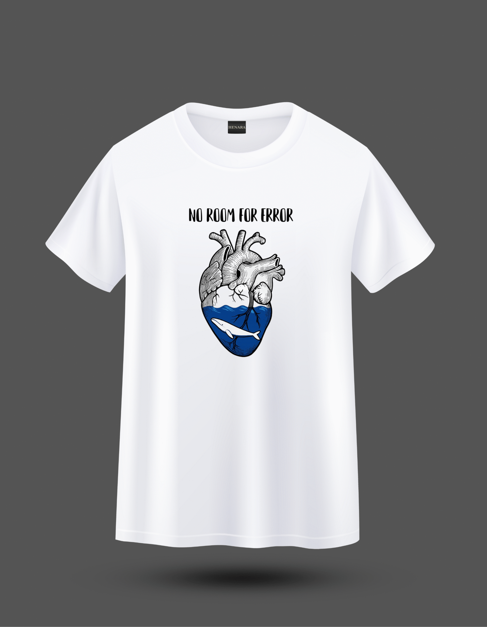 No Room For Error “Blue Heart” tişörtü, hayatın kırılganlığını ve kusursuzluğun önemini sanatsal bir metaforla aktaran özel bir tasarımdır. Anatomik bir kalbin detaylı çizimi, alt kısmında deniz ve özgürce yüzen beyaz bir balina ile birleşerek insan ruhunun derinliklerini simgeler. Üst kısmında yer alan “No Room For Error” yazısı, yaşamın en küçük hataya bile yer bırakmadığına dair güçlü bir mesaj verir. Bu tasarım, aynı anda hem estetik hem de felsefi bir derinlik taşır.