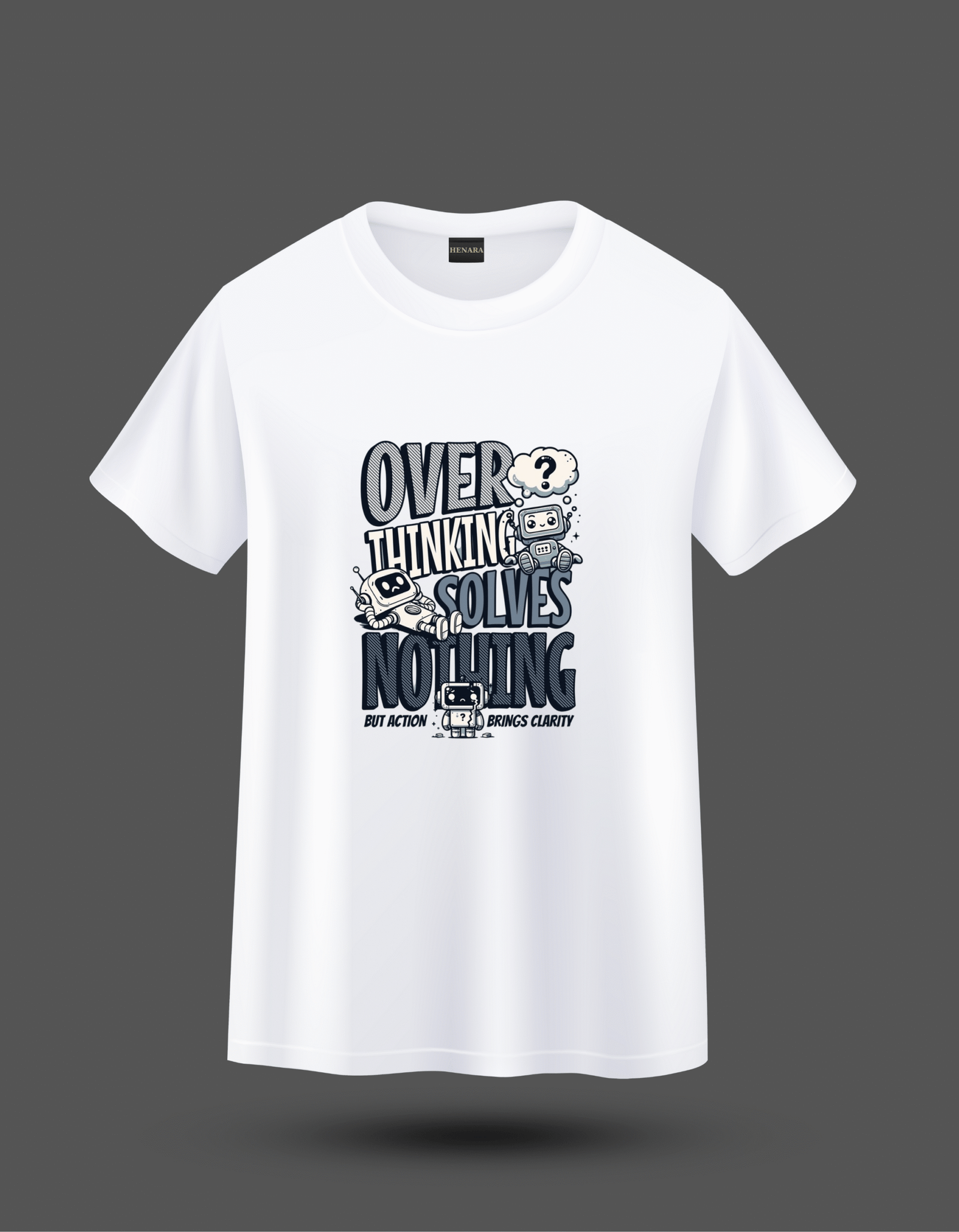 Overthinking “Solves Nothing” tişörtü, modern hayatın en yaygın sorunlarından birine mizahi ve düşündürücü bir dokunuş getiriyor. Üzerinde yer alan “Overthinking Solves Nothing – But Action Brings Clarity” ifadesi ve eğlenceli çizgi robot karakterleri, fazla düşünmenin çıkmazlarını ve harekete geçmenin önemini güçlü bir şekilde vurguluyor. Dinamik tipografi ve illüstrasyon tarzı, tasarıma enerjik ve modern bir hava katıyor.